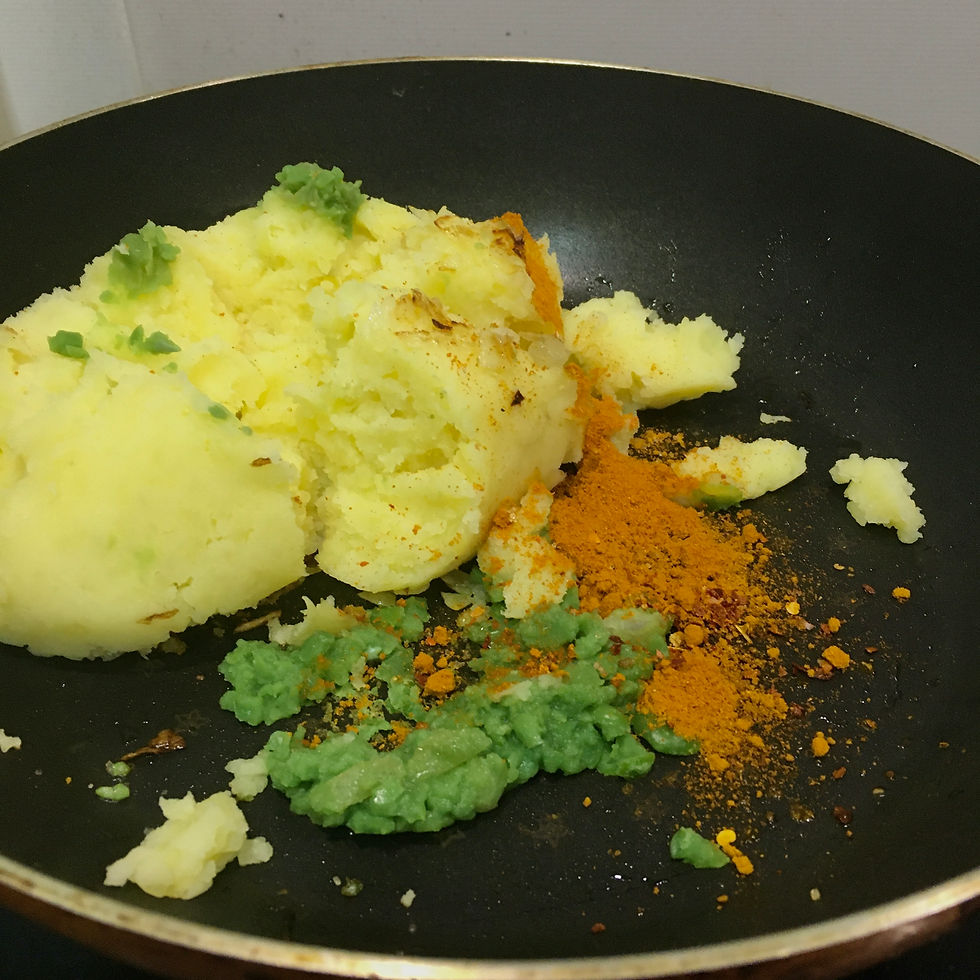 3. Add in the mashed potatoes, mashed green peas, curry powder, chili powder, sugar and salt.